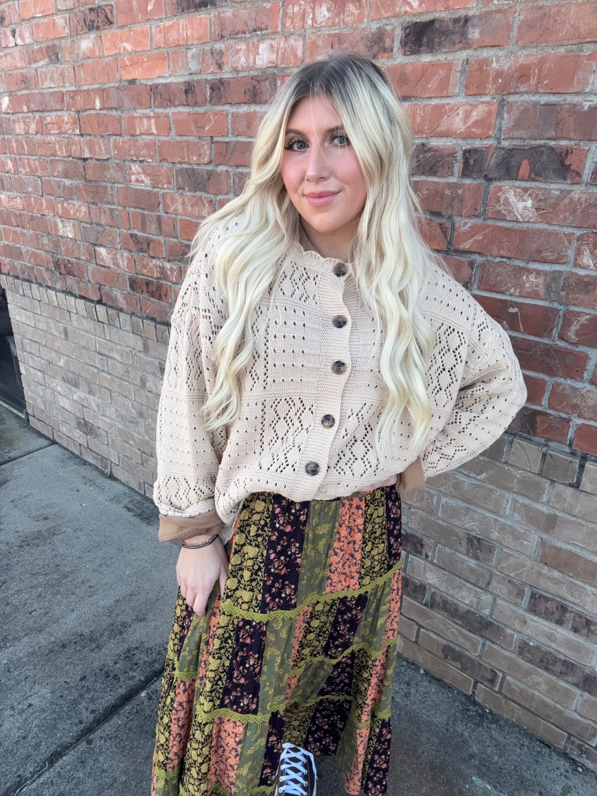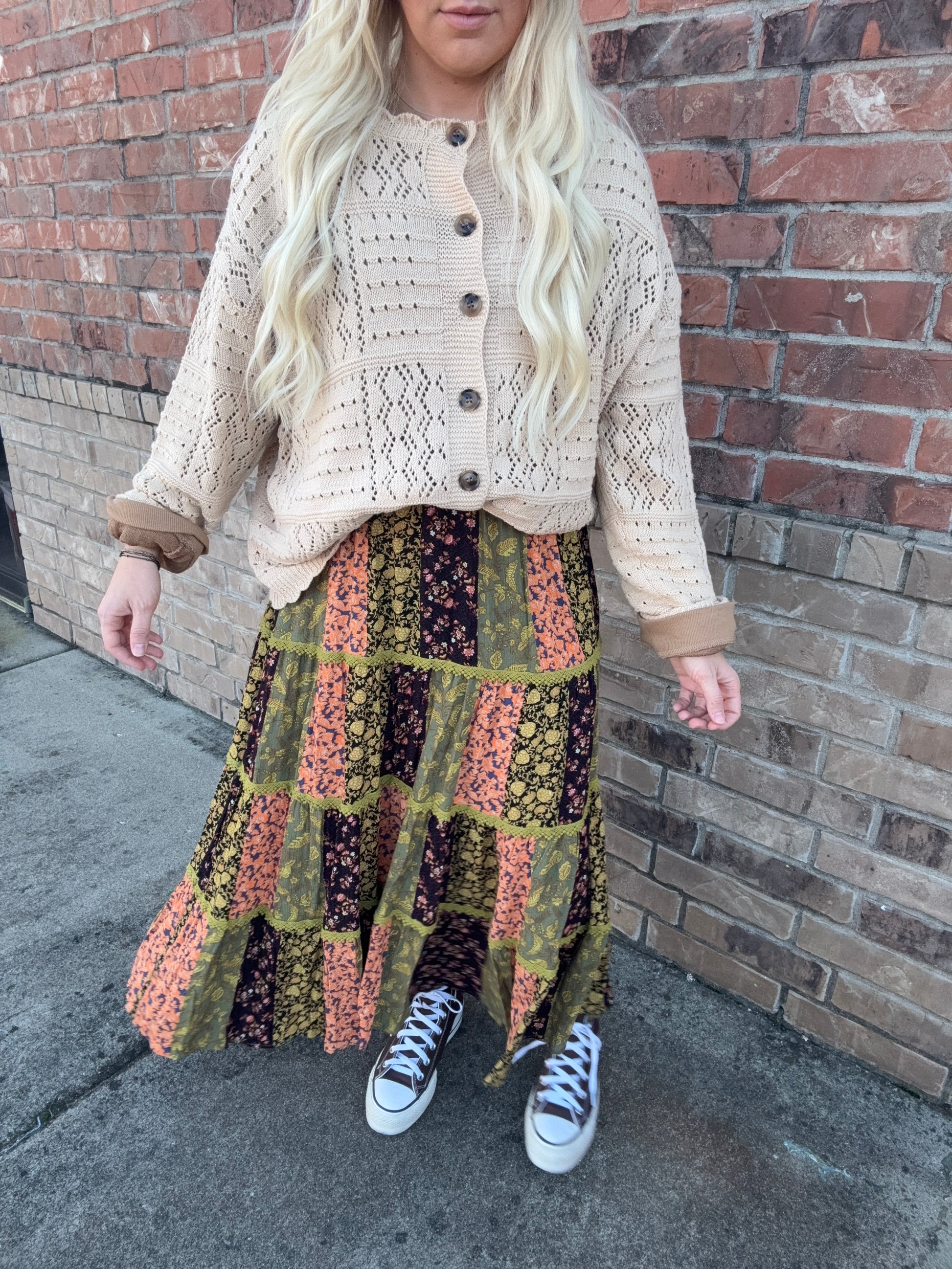 Say hello to full fall vibes β even if it decided to show up early. π This printed rayon gauze maxi features a tiered patchwork design in dreamy pumpkin + olive tones. Lightweight and breathable, itβs perfect to wear now and layer later. Style it low on the waist as a maxi skirt or pull it higher as a dress β 2 looks in one!