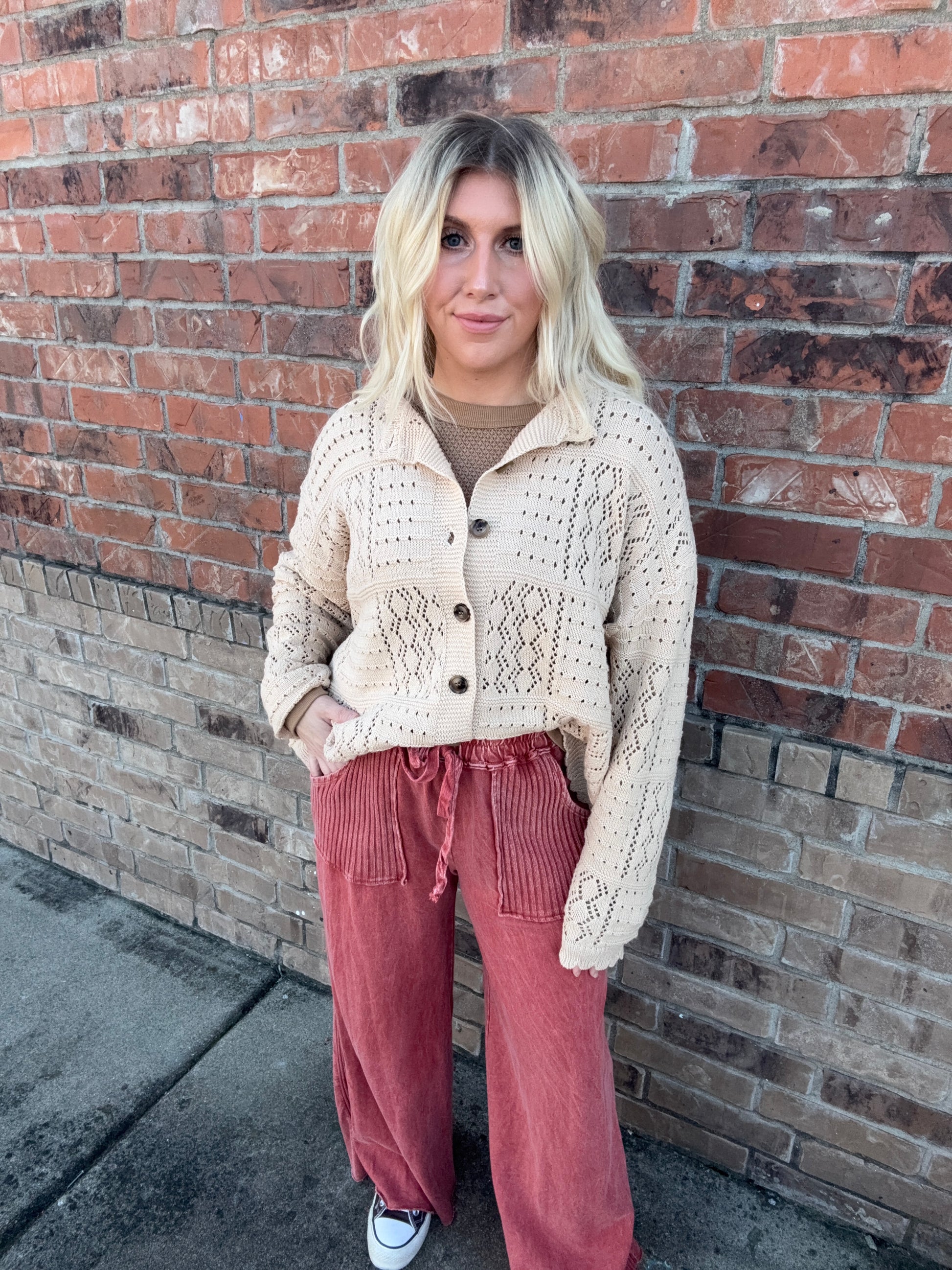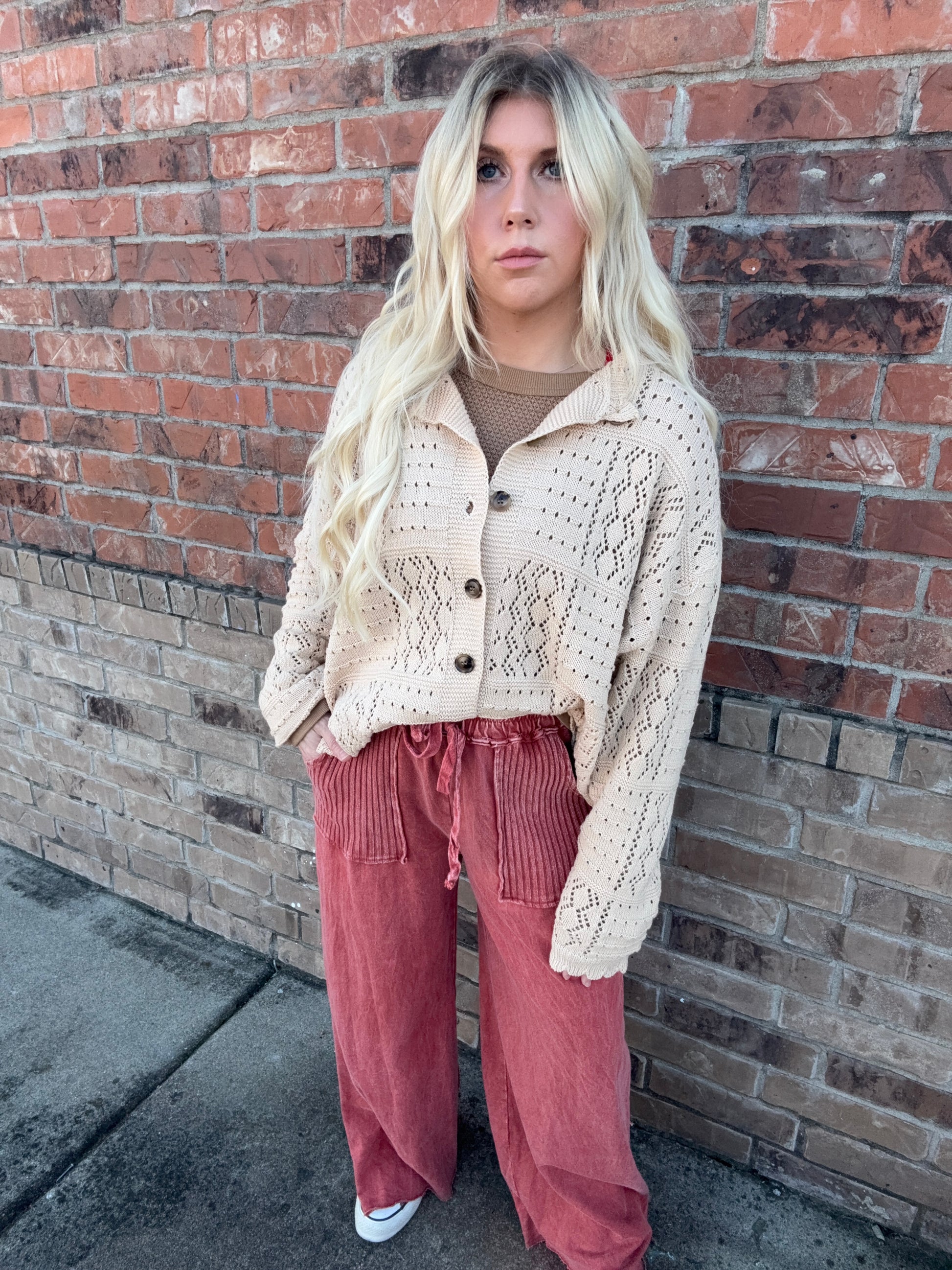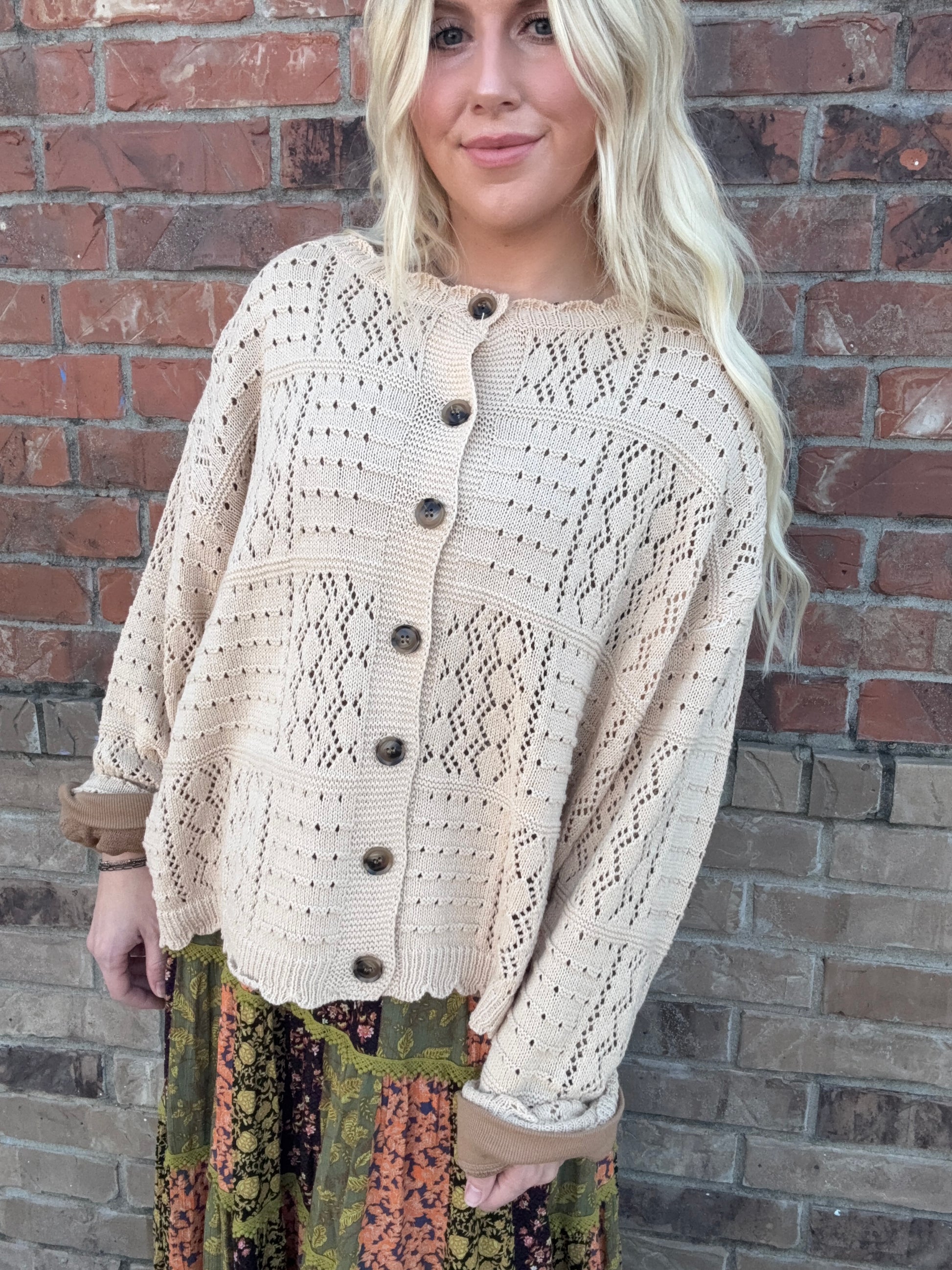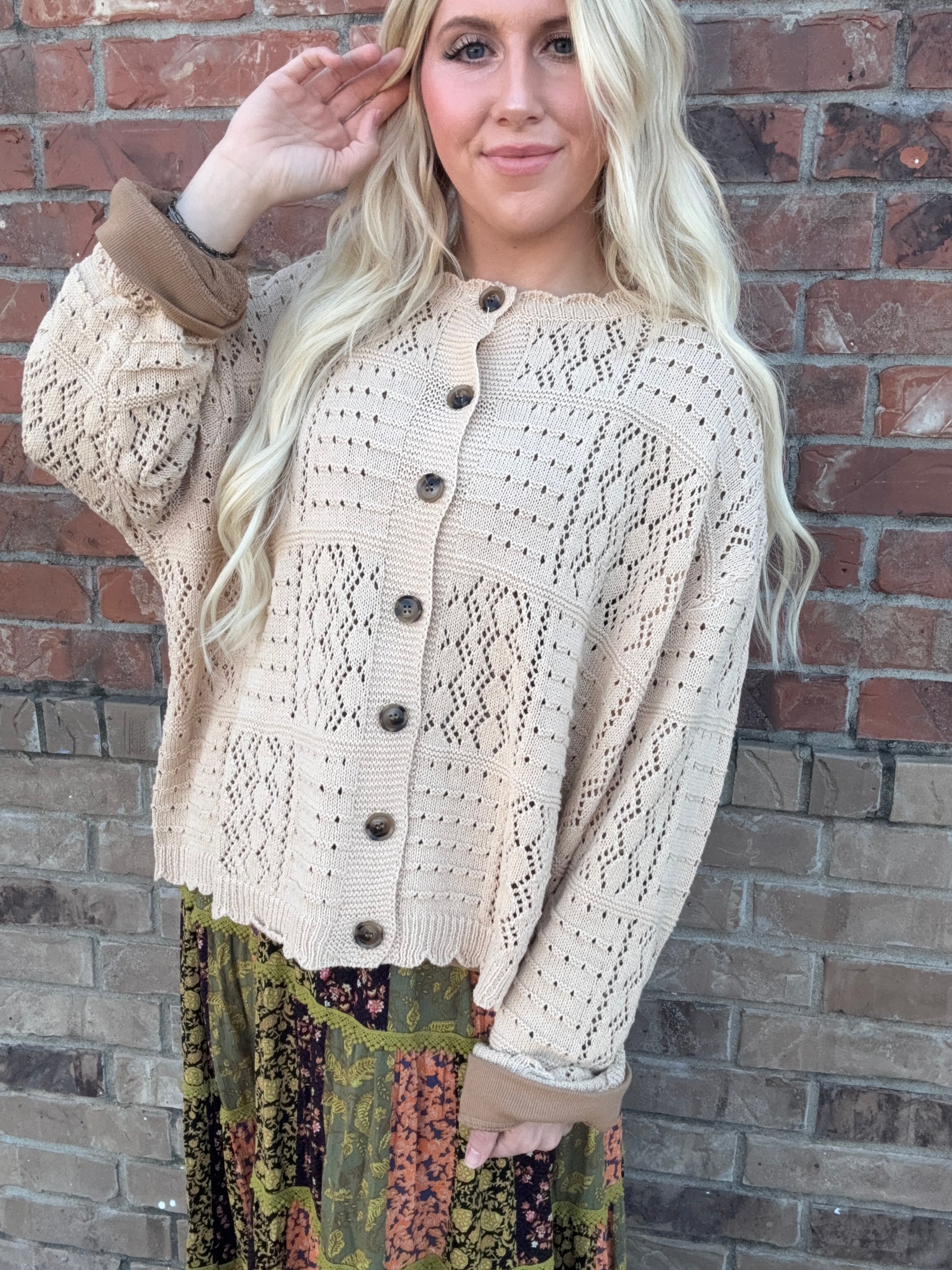 The Cottage Lane Cardigan is a breathable knit with the sweetest crochet-inspired detailing and an easy, relaxed fit. Wear it buttoned or layered open — it drapes just right either way. Lightweight enough for year-round styling, cozy enough for crisp mornings.