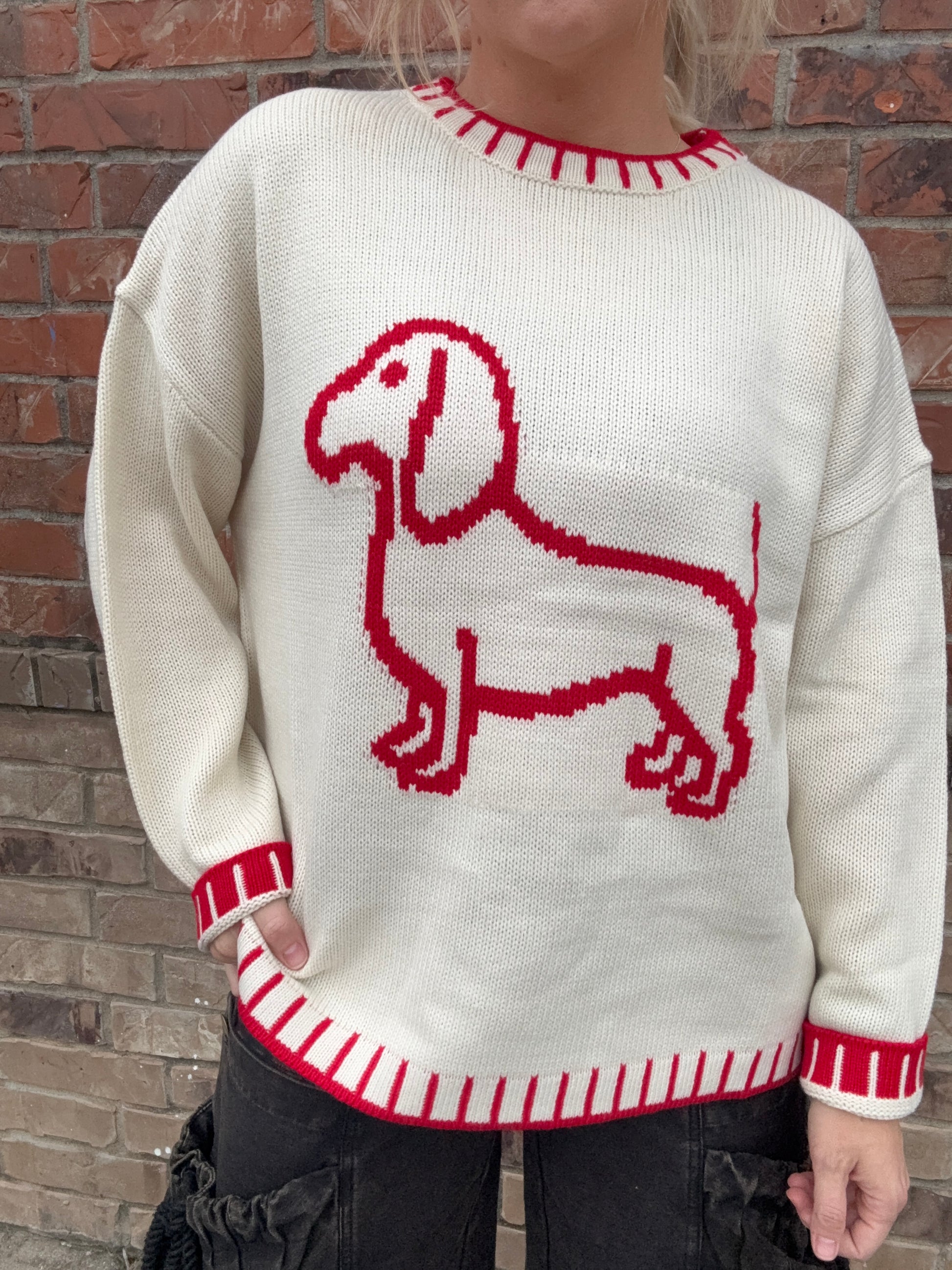 Cozy meets playful in this oatmeal knit pullover featuring a bold red dachshund design and stitched trim. The intarsia-style pattern gives it a handmade feel — and the slight line you may notice across the front is simply part of the knit construction (not a flaw!).