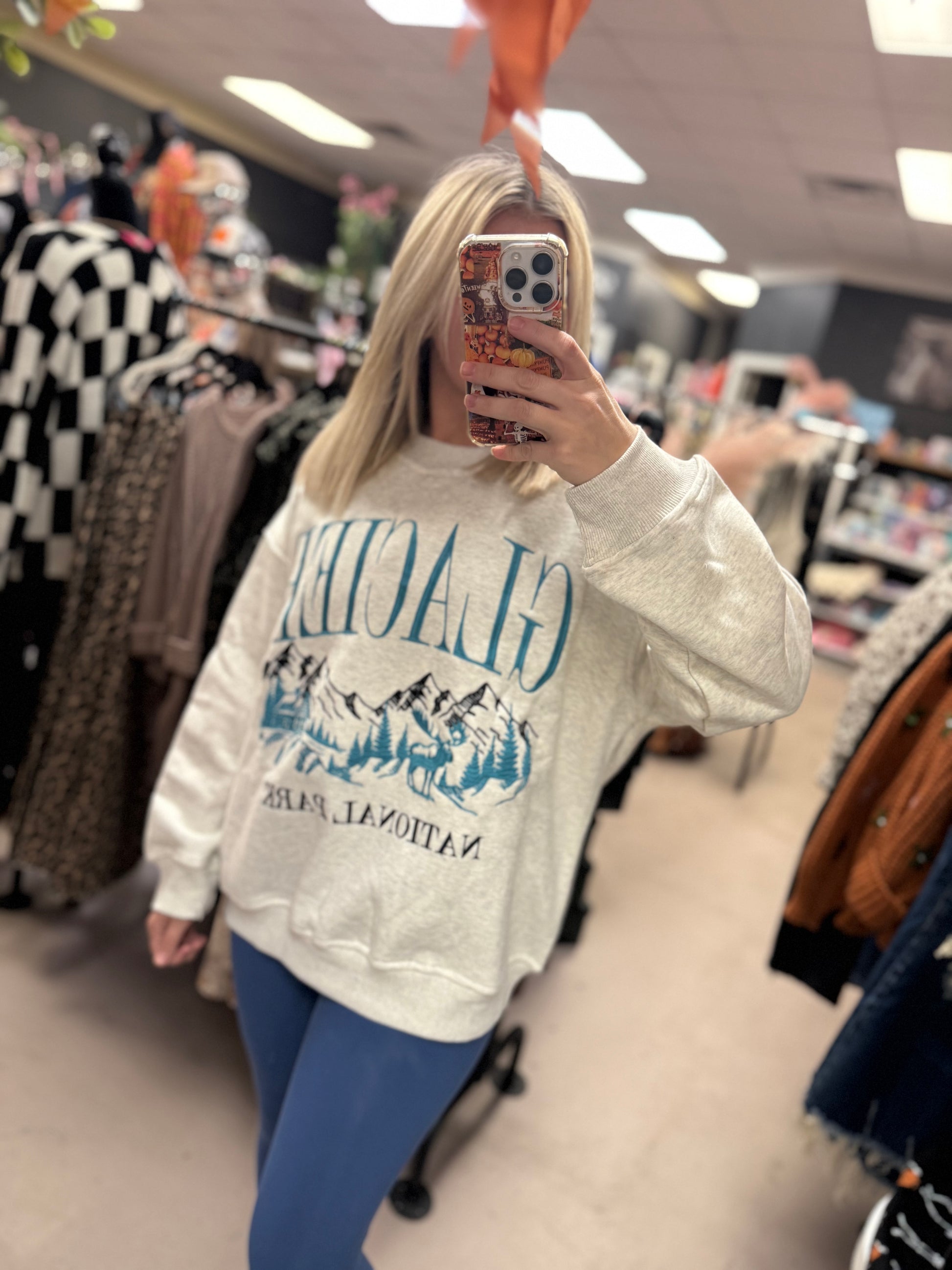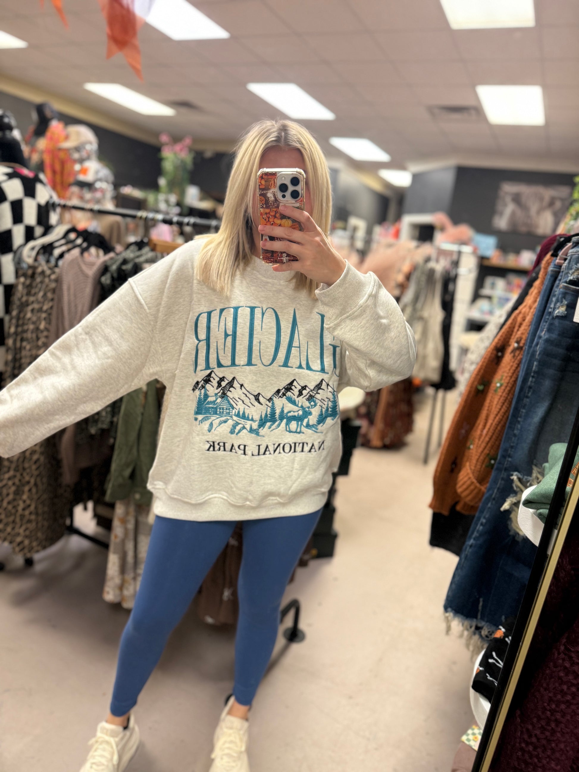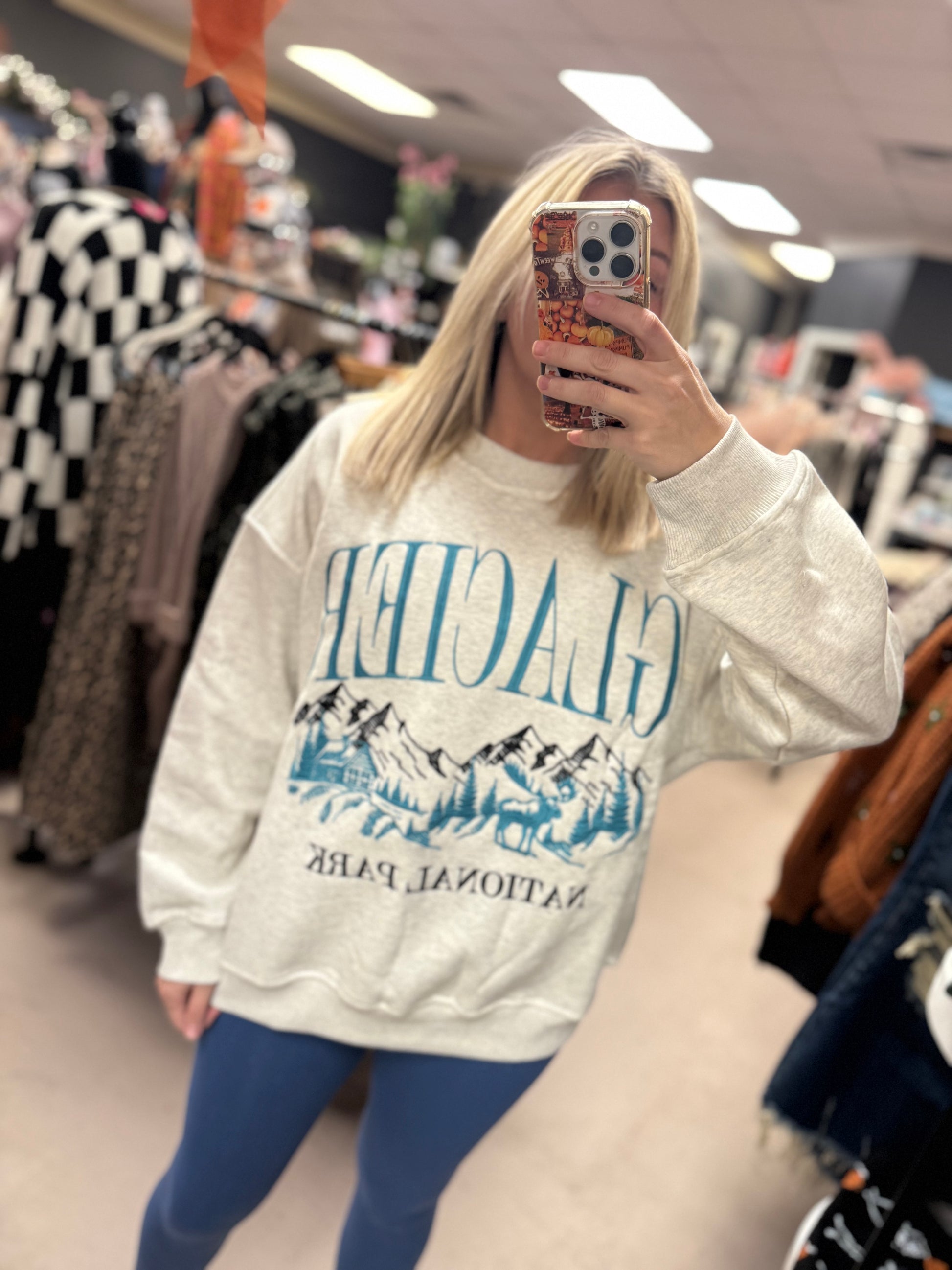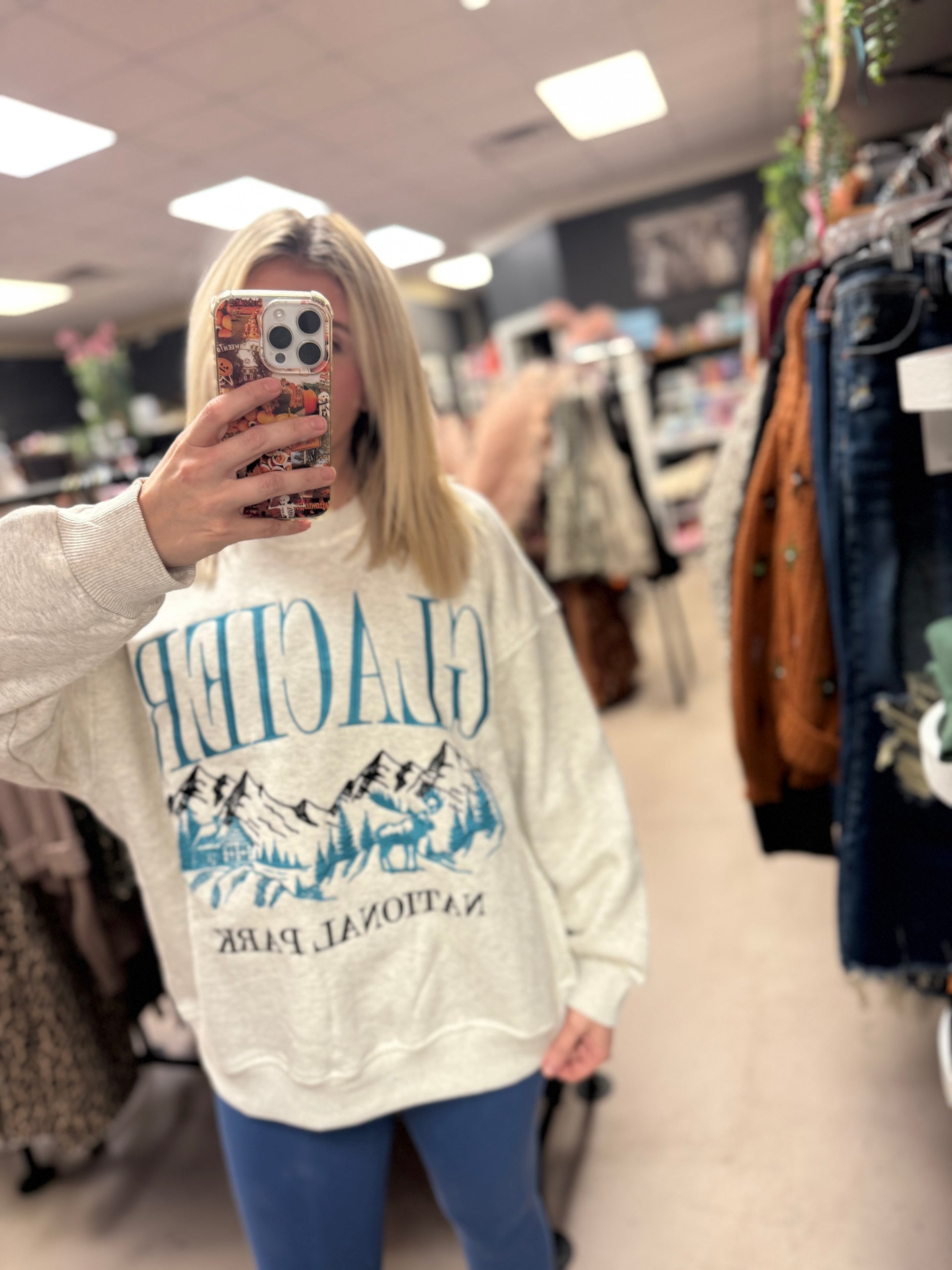 Cozy, soft, and made for adventure — this Glacier National Park sweatshirt gives that laid-back, mountain-town vibe we all love. Featuring a vintage-style landscape graphic in deep teal tones, it’s the perfect mix of comfy and cute.