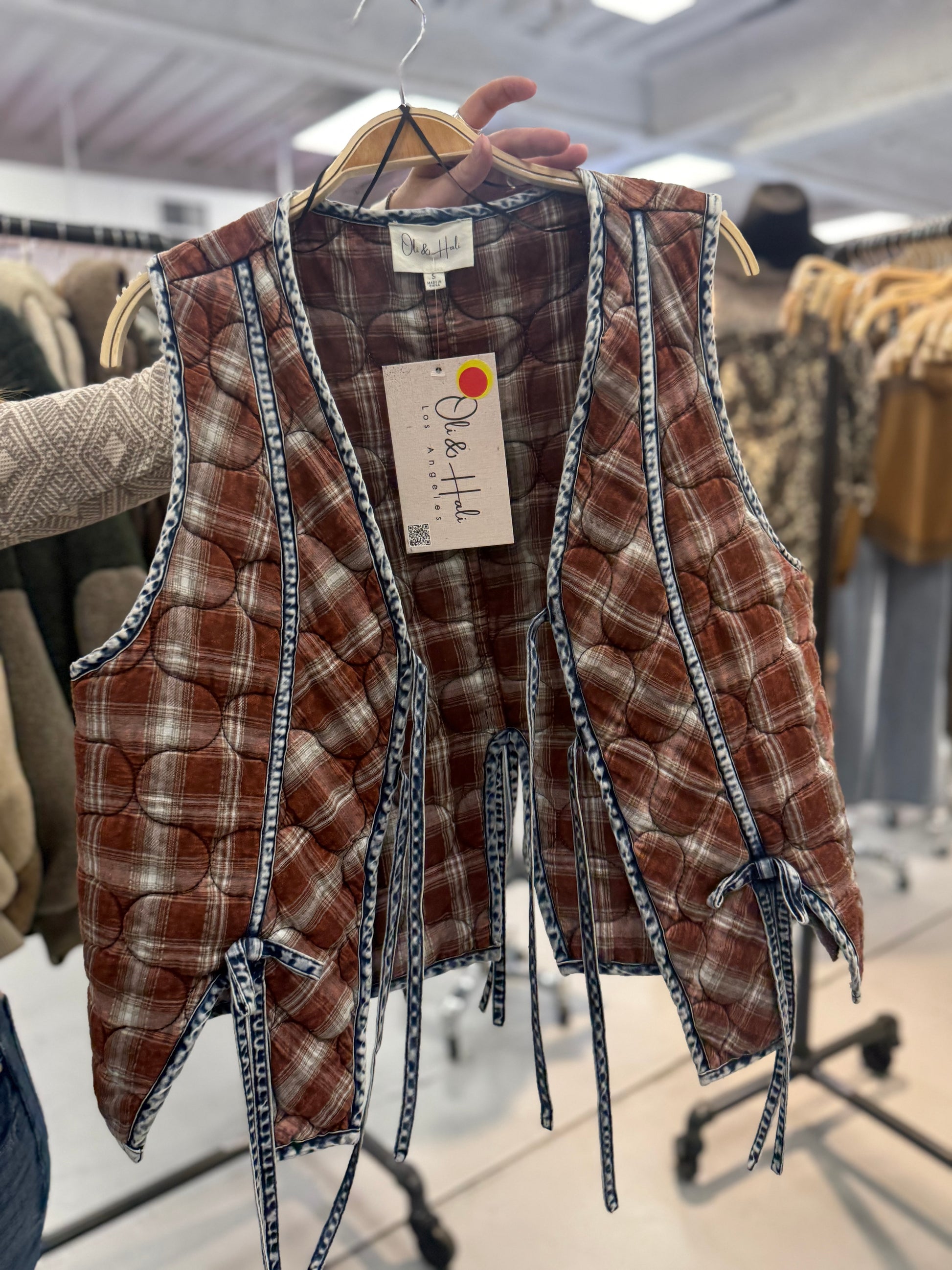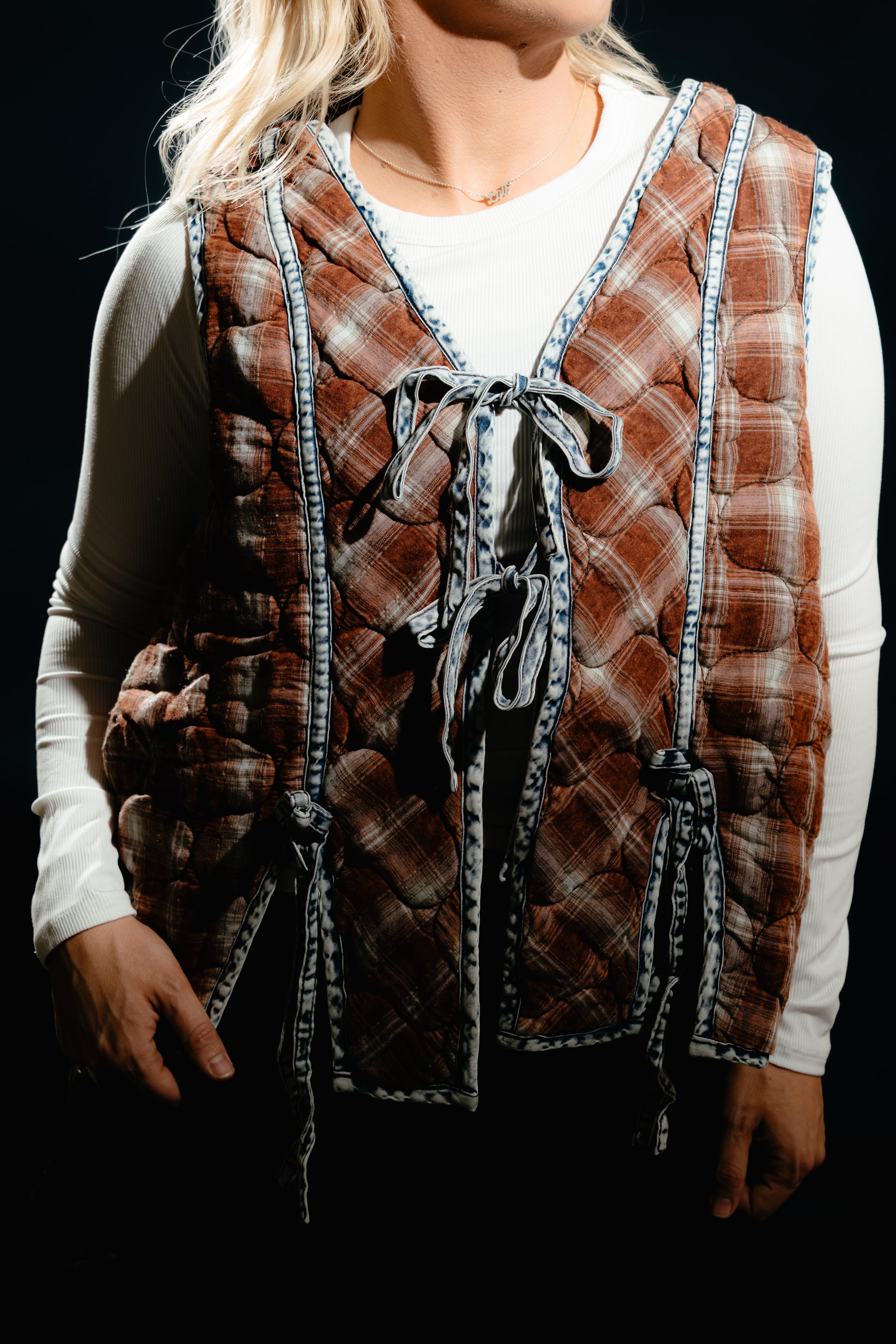Stay cozy with a touch of rustic alure in this washed plaid quilted vest. Featuring a unique tie-front design and contrast trim, this vest is timeless & versatile. The quilted texture adds warmth without the bulk, making it the perfect layering piece over tees, flannels, or lightweight sweaters.