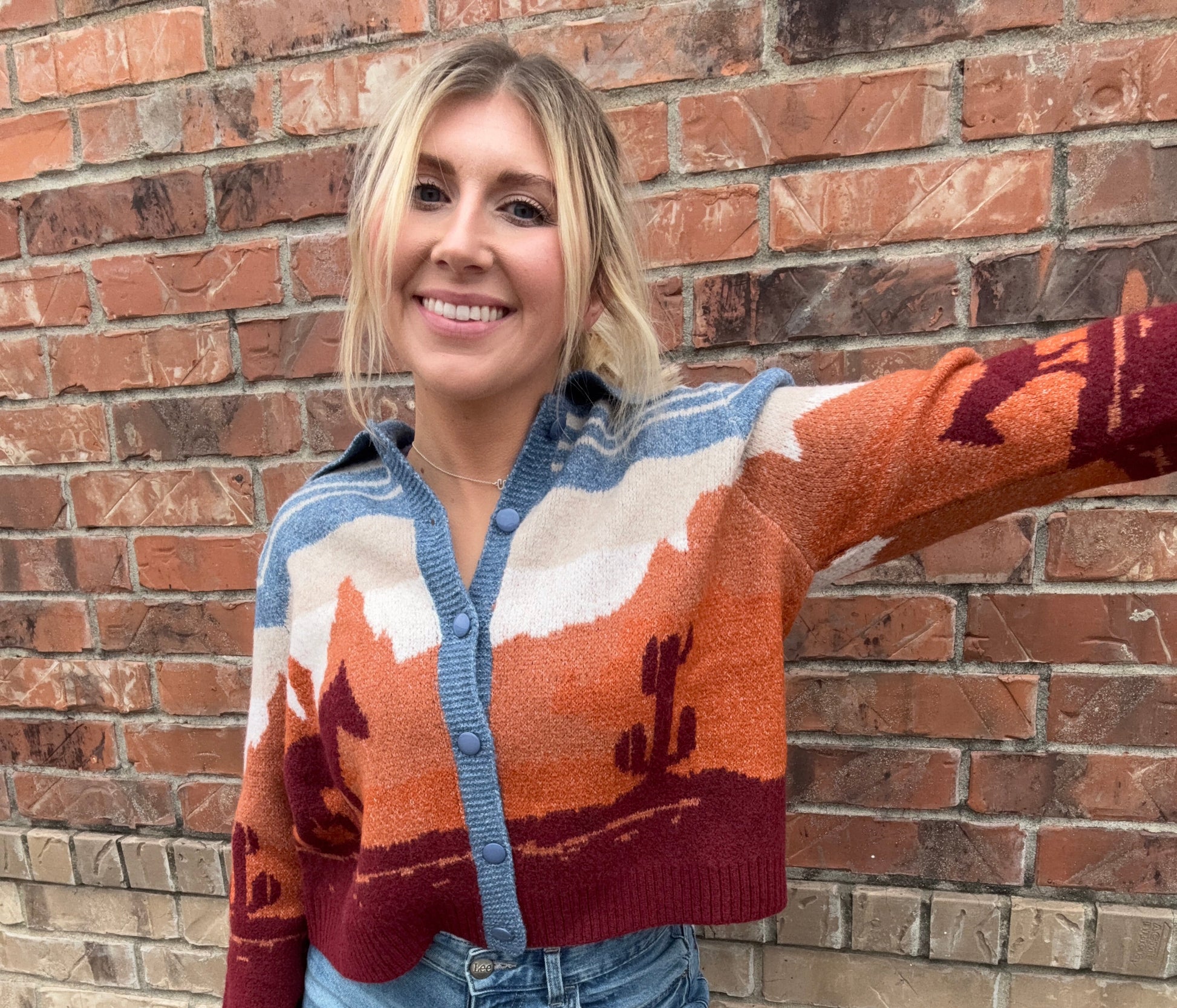 Saddle up in this sunset-inspired statement piece 🤎 Our Mustang Spirit Cardigan brings desert dreams to life with its rich blend of rust, maroon, and denim blue tones. The relaxed fit and soft knit fabric make it perfect for layering through cooler seasons — cozy without the bulk.